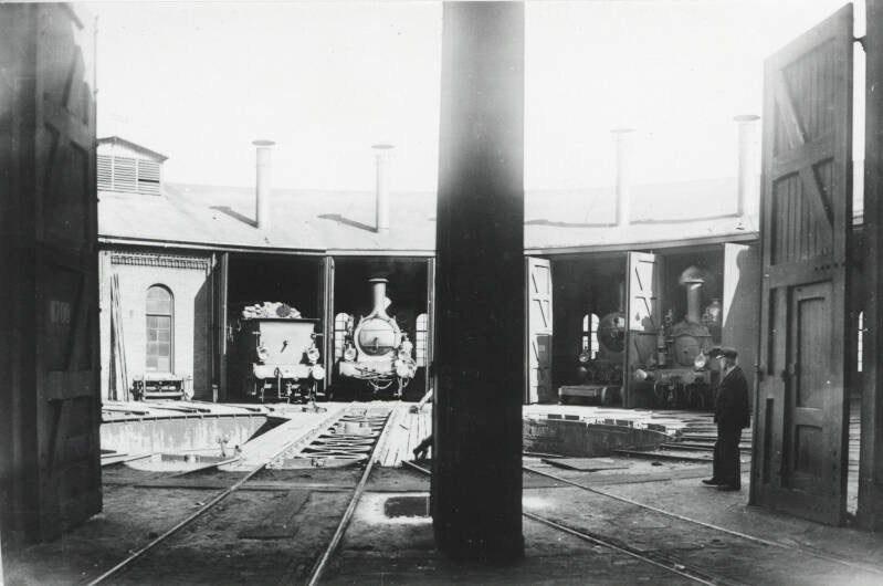 8. Catalogusnummer: 170069. De locomotiefloods van de N.S. te Roosendaal, met enkele stoomlocomotieven.
