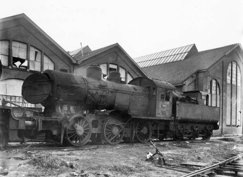 6. Catalogusnummer: 163520. De tijdens de oorlog vernielde stoomlocomotief NS 3414 (serie NS 3400) bij de centrale werkplaats te Zwolle. Datering: Tussen 01-01-1946 en 31-12-1946. Foto: Nederlandse Spoorwegen - Het Utrechts Archief / hetutrechtsarchief.nl