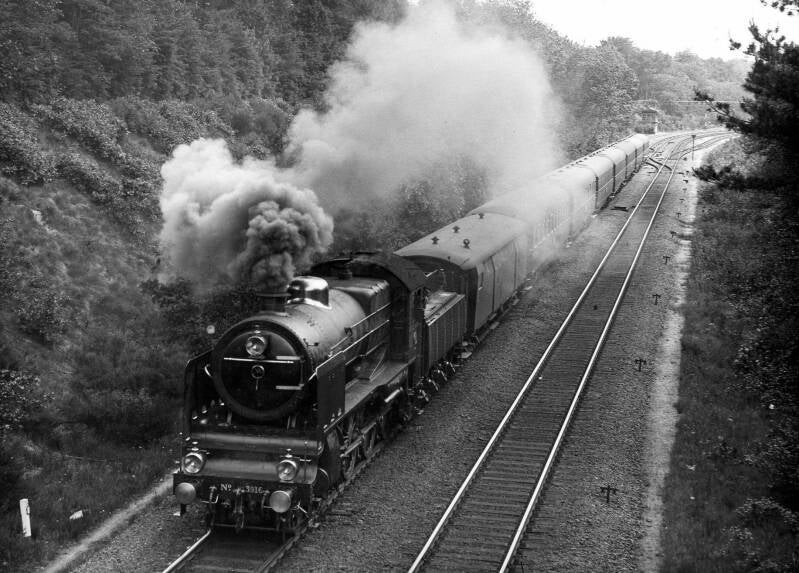 13. Catalogusnummer: 151313. Stoomlocomotief NS 3916 (serie NS 3900) met een D-trein nabij Baarn. Datering: Juni 1938.