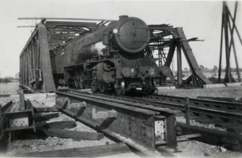 7. Catalogusnummer: 160901. Stoomlocomotief uit de serie NS 5000/5100 ("Austrity", ex War Department nr. 73711) op de brug over het Wilhelminakanaal te Tilburg. Datering: 4 augustus 1946. Foto: Onbekend - Het Utrechts Archief / hetutrechtsarchief.nl