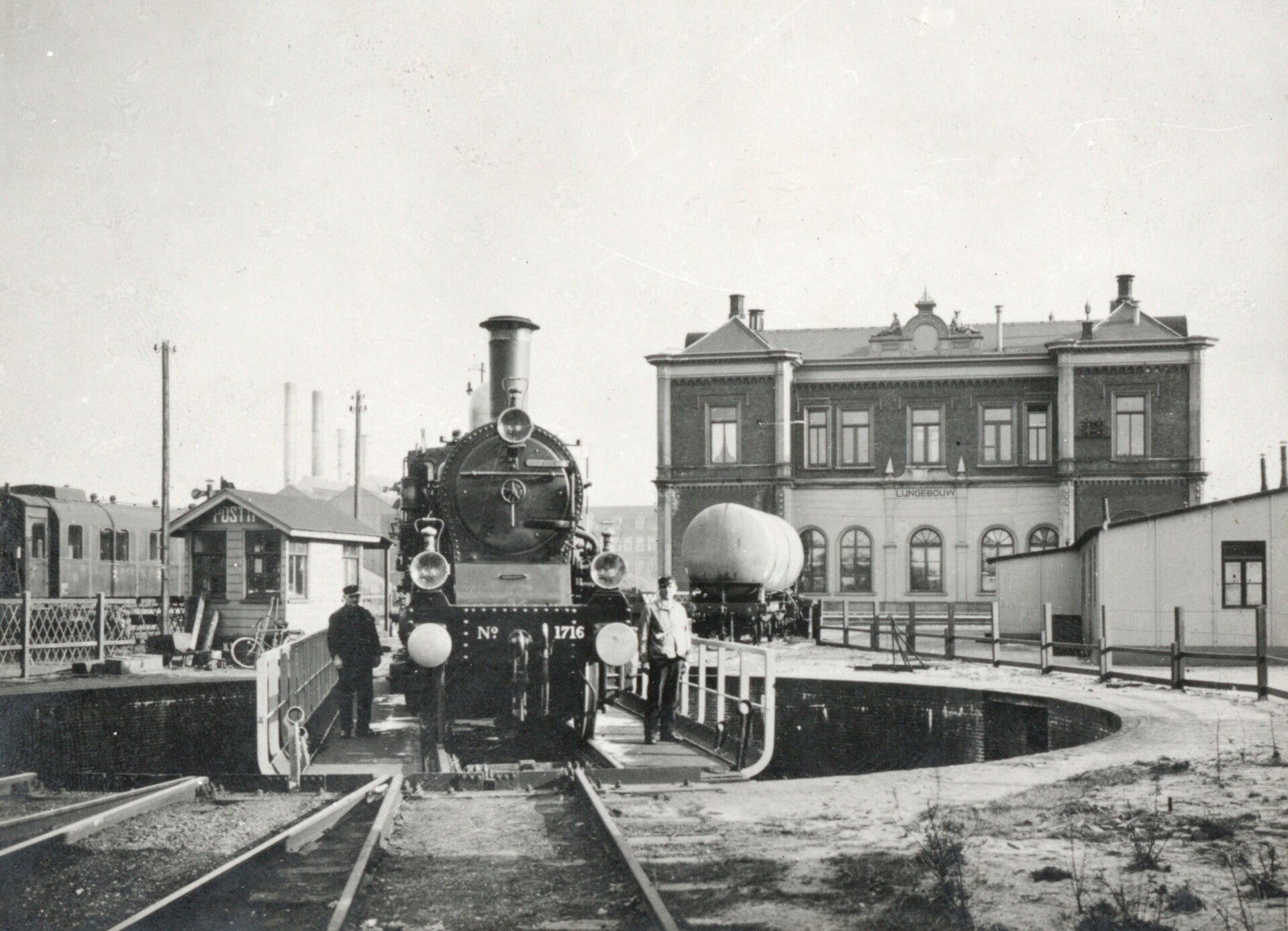 26. Catalogusnummer: 172215. Stoomlocomotief NS 1716 (serie NS 1700/1800) op de draaischijf bij het N.S.-station Utrecht C.S. te Utrecht, met op de achtergrond het Lijngebouw. Datering: Tussen 01-01-1920 en 31-12-1930.