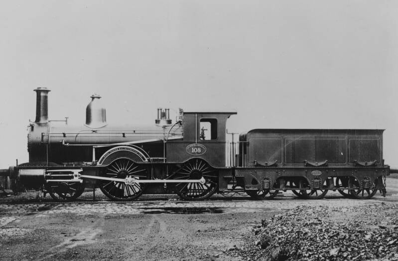 6. Catalogusnummer: 151390. Stoomlocomotief nr. 108 uit de serie 101-150 van de S.S. (Staatsspoorwegen) later omgenummerd als NS 908 (serie NS 900, NS 901-950). Datering: tussen 01-01-1872 en 31-12-1872. Foto: Onbekend - Het Utrechts Archief / hetutrechtsarchief.nl - Licentiestatus: Publiek Domein