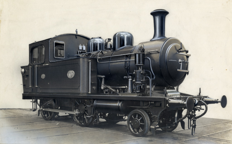 1. Catalogusnummer: 808482. De fabrieksnieuwe stoomlocomotief nr. 1102 (serie 1101-1104) van de H.S.M. Dit locomotieftype is later vernummerd tot de serie NS 7400 (Nederlandse Spoorwegen). Datering: Tussen 01-01-1920 en 31-12-1920.