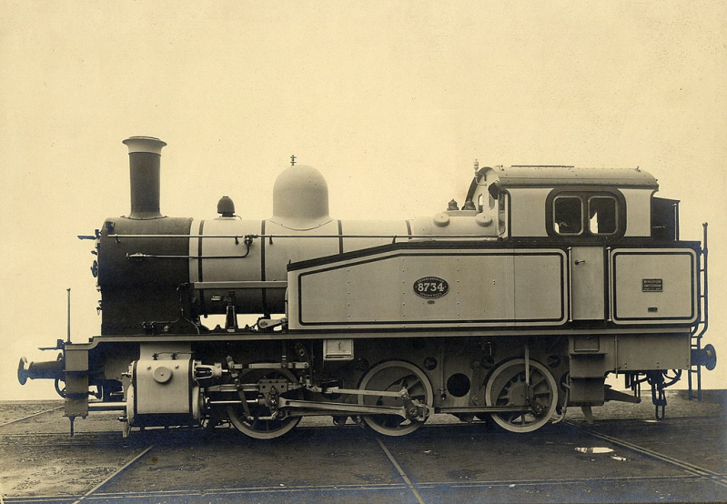5. Catalogusnummer: 165804. Fabrieksfoto van stoomlocomotief NS 8734 (serie NS 8700).